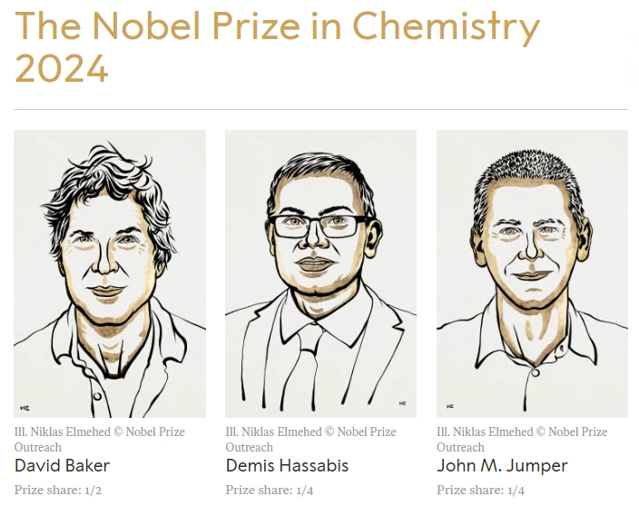 2024年諾貝爾化學(xué)獎(jiǎng)?lì)C給“AI蛋白質(zhì)設(shè)計(jì)和結(jié)構(gòu)預(yù)測”,一半授予大衛(wèi)·貝克(David Baker),“以表彰在計(jì)算蛋白質(zhì)設(shè)計(jì)方面的貢獻(xiàn)”;另一半則共同授予德米斯·哈薩比斯(Demis Hassabis)和約翰·喬普(John M. Jumper),“以表彰他們在蛋白質(zhì)結(jié)構(gòu)預(yù)測方面的成就”。