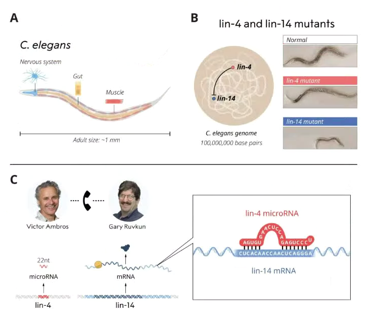 microRNA(miRNA)及其功能的發(fā)現(xiàn)可以追溯到20世紀(jì)80年代。當(dāng)時Ambros和Ruvkun博士還是麻省理工學(xué)院的博士后研究員,Ambros和Ruvkun對不同細胞類型的發(fā)育方式很感興趣,他們在研究lin-4和lin-14基因如何調(diào)節(jié)秀麗隱桿線蟲(C.elegans)的發(fā)育時間。想要了解lin-4基因突變?nèi)绾巫柚剐沱愲[桿線蟲幼蟲發(fā)育成完全成形的動物?lin-14基因突變又是如何導(dǎo)致幼蟲過早成熟的?