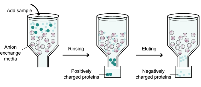 離子交換層析是一種以離子交換樹脂或化學(xué)鍵合離子交換劑為固定相,利用被分離組分離子交換能力的差別或選擇性系數(shù)的差別而實現(xiàn)分離的方法。當(dāng)一定量的溶液通過交換柱時,由于溶液中的離子不斷被交換而濃度逐漸減少,因此也可以全部被交換而吸附在交換劑上。融合的蛋白質(zhì)能夠根據(jù)逐漸提升過柱液中的含鹽量或者提升過柱液的pH值過柱出來。