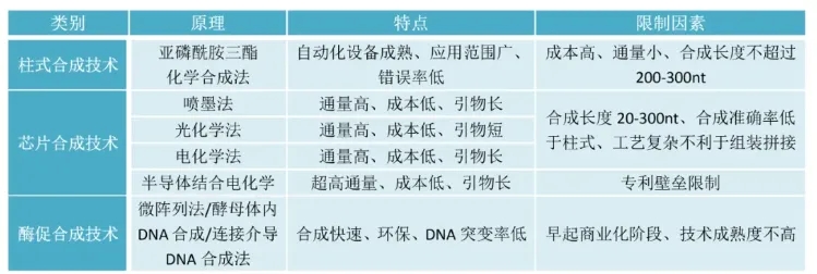 DNA合成技術(shù)主要分為化學(xué)法和酶促法。酶促法能從頭合成1005個堿基的DNA序列,這是單次合成最長的寡核苷酸。但酶促合成技術(shù)成本高,尚未實(shí)現(xiàn)大規(guī)模的商業(yè)應(yīng)用。目前最為成熟且被廣泛應(yīng)用的依舊是化學(xué)法,包括柱式合成技術(shù)、芯片合成技術(shù)。