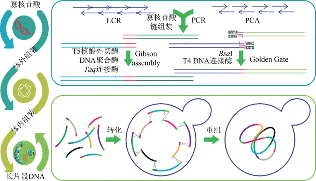 DNA片段從頭合成的長度有限,更長基因或基因組需要通過寡核苷酸片段的酶促組裝或體內(nèi)組裝獲得。DNA組裝方法分為三類:酶依賴的DNA組裝、非酶依賴的DNA組裝、依賴于體內(nèi)同源重組的DNA組裝。