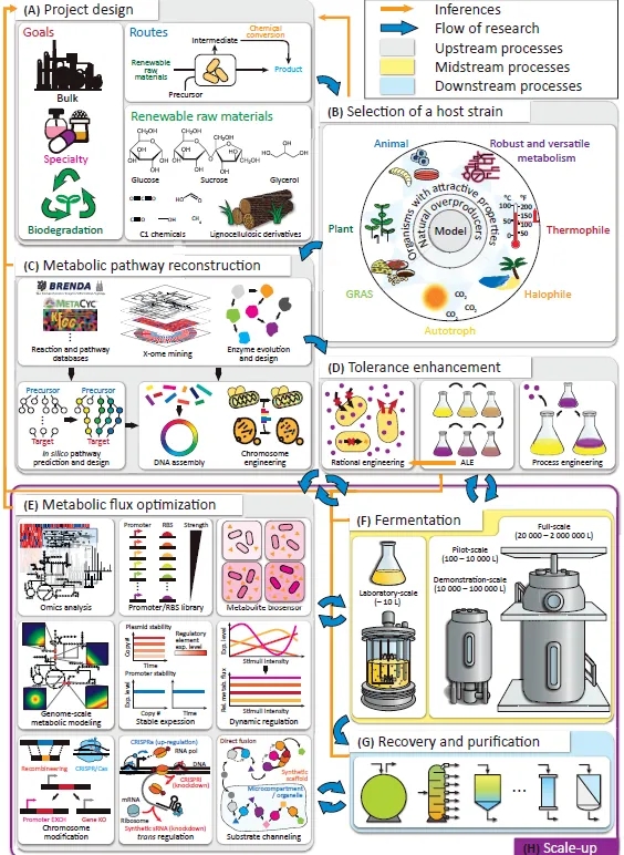 8. 放大:根據(jù)回收和純化的數(shù)據(jù)對代謝通量進行反復(fù)優(yōu)化,以實現(xiàn)從實驗室規(guī)模到商業(yè)化生產(chǎn)的放大。