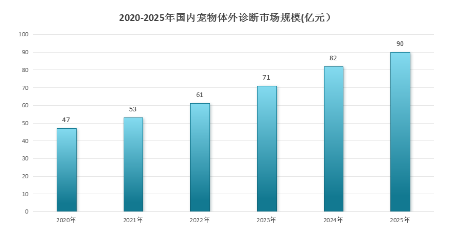 近幾年,隨著養(yǎng)寵群體日漸增長,寵物經(jīng)濟發(fā)展迅速,寵物診斷行業(yè)也大規(guī)模興起。據(jù)統(tǒng)計,2022年國內(nèi)寵物疾病診療總體市場規(guī)模預(yù)估為110億元,未來將超過180億。其中寵物體外診療市場規(guī)模大約為61億元,年復(fù)合增長率超過20%,預(yù)計2025年可達到90億元。