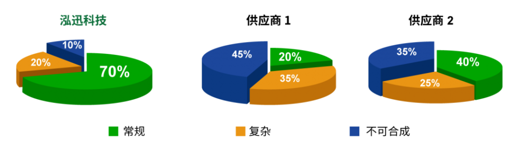 泓迅科技運(yùn)用先進(jìn)的算法自主研發(fā) CI (Complexity Index) 系統(tǒng),針對(duì)重復(fù)序列、發(fā)卡結(jié)構(gòu)、高GC、poly 結(jié)構(gòu)等復(fù)雜基因智能分析,優(yōu)化DNA合成組裝工藝。下方是泓迅科技與其他供應(yīng)商針對(duì)2000個(gè)合成基因的分析結(jié)果。