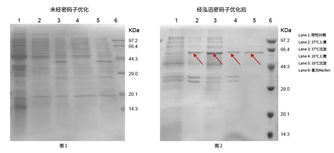 1.蛋白R0103,分子量53.48kDa,未優(yōu)化序列分別構建于pET-28a(+)載體,采用37℃及16℃兩種條件進行異源蛋白表達,未優(yōu)化的序列未見目的蛋白表達,經(jīng)過泓迅生物NGTMCodon密碼子優(yōu)化2.0在37℃和16℃均有顯著目標蛋白表達。