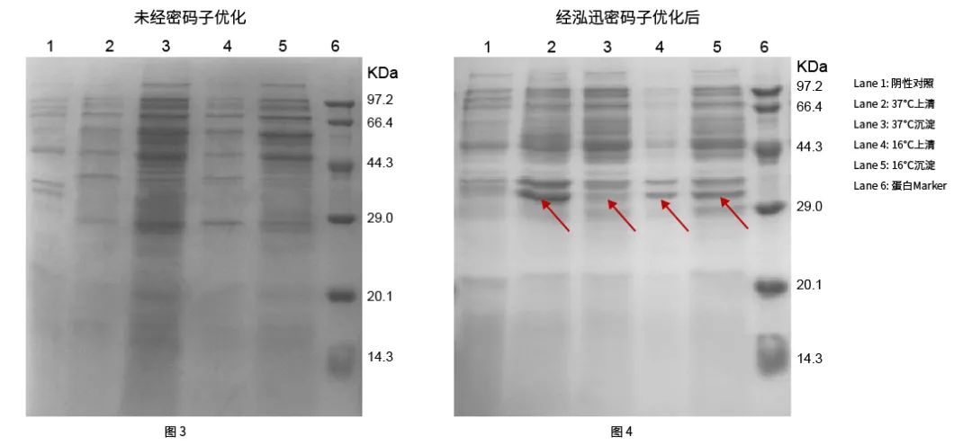 2.蛋白R0118,分子量35.77kDa,未優(yōu)化序列分別構建于pET-28a(+)載體,采用37℃及16℃兩種條件進行異源蛋白表達,未優(yōu)化的序列未見目的蛋白表達,經(jīng)過泓迅生物NGTMCodon密碼子優(yōu)化2.0在37℃和16℃均有顯著目標蛋白表達,可溶性蛋白表達比例較高。