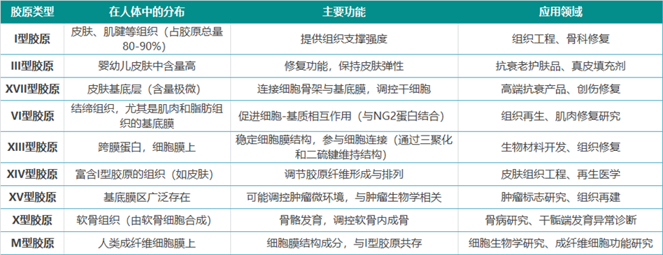 重組膠原蛋白正在成為抗衰老和醫(yī)美領(lǐng)域的熱門成分,其中III型膠原蛋白因在嬰兒皮膚中的高含量,被稱為“嬰兒膠原”,能夠促進(jìn)膠原新生、提升彈性、加速修復(fù),是公認(rèn)的核心抗老成分。在醫(yī)療應(yīng)用上,膠原蛋白敷料能為傷口提供濕潤環(huán)境和保護(hù)屏障,促進(jìn)愈合,尤其是XVII型膠原蛋白在調(diào)節(jié)干細(xì)胞修復(fù)方面表現(xiàn)突出。隨著技術(shù)進(jìn)步,重組膠原蛋白在醫(yī)美市場(chǎng)迅速崛起,不僅效果優(yōu)于傳統(tǒng)成分,還能解決玻尿酸填充后常見的問題,正逐步成為新的主流選擇。