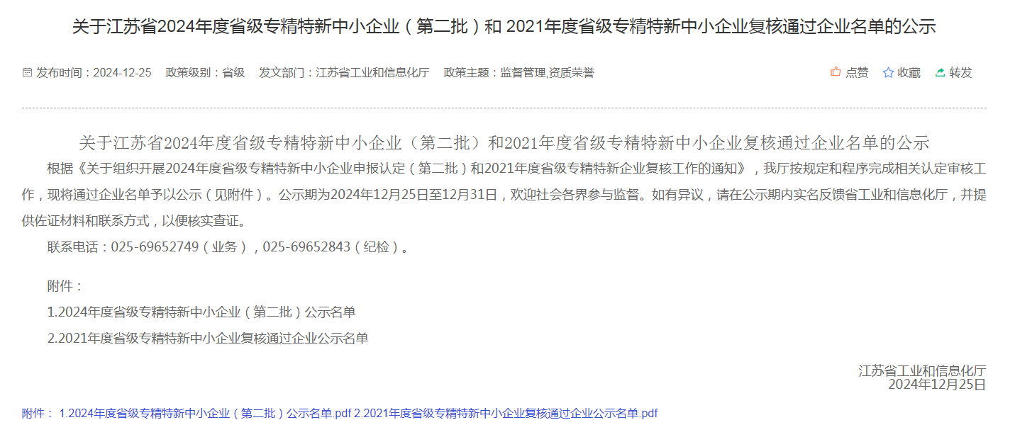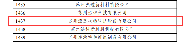 2024年12月25日,江蘇省工業(yè)和信息化廳正式發(fā)布《關(guān)于2024年度第二批江蘇省專精特新中小企業(yè)擬認定名單和復(fù)核擬通過名單的公示》。泓迅生物憑借先進的技術(shù)積累與卓越的創(chuàng)新能力,成功入選,榮獲“江蘇省專精特新中小企業(yè)”稱號。