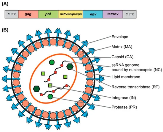 (A) 野生型HIV-1基因組簡圖;(B) 慢病毒的顆粒結(jié)構(gòu)。
